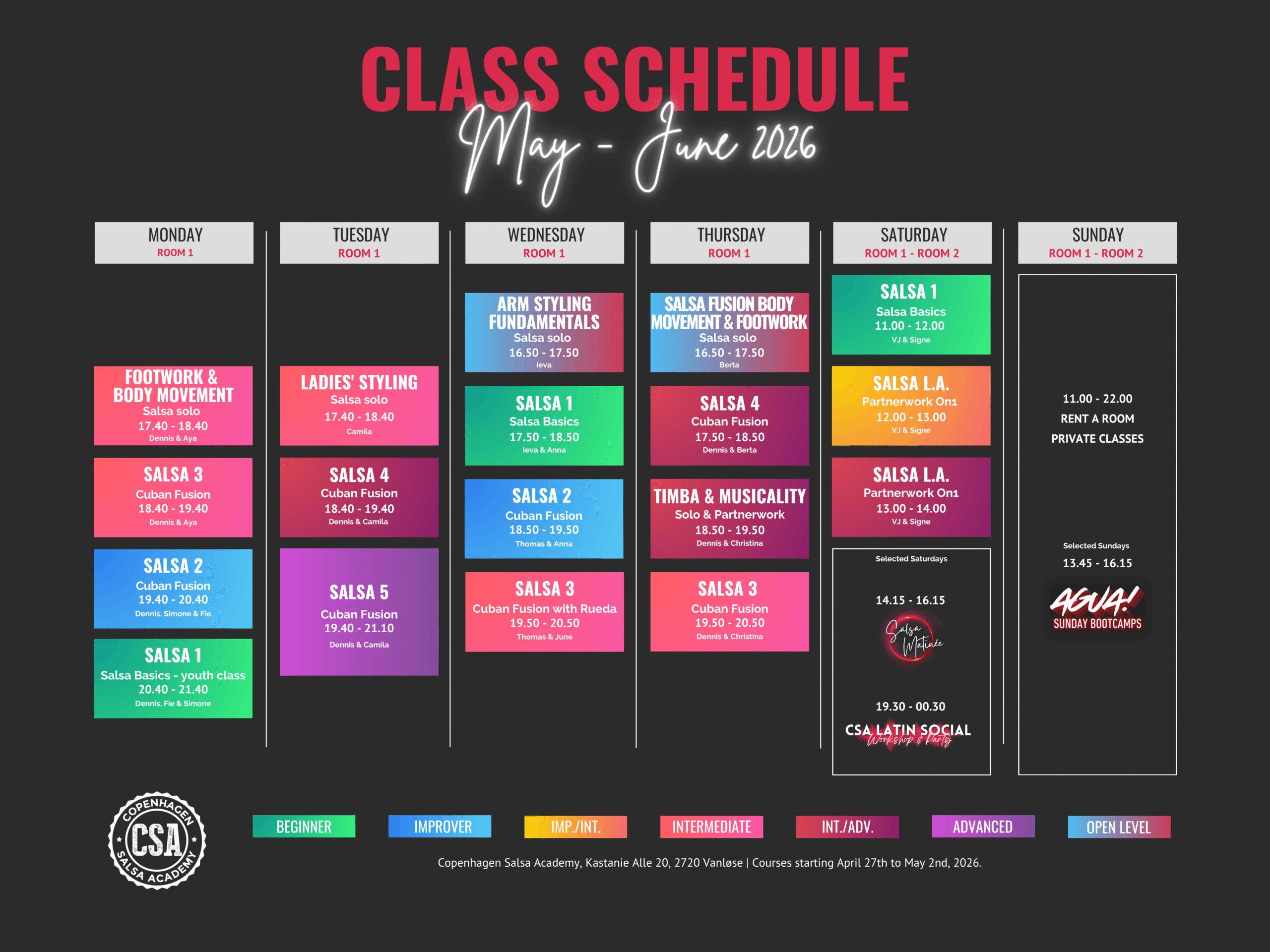 ✓ Do I need a partner to enroll? No, it is not required. You will be dancing in groups/bubbles, with partner change inside the groups. Otherwise, if you have a partner already, you can also choose to only dance together. All classes are taught in English (except CSA Kids, in Danish).